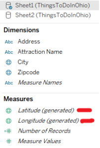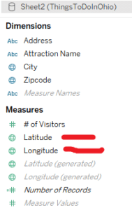 if you load this data, Tableau generate Latitudes and Longitudes for the City and Zipcode but not the Attraction’s physical address. If two attractions are listed in the same zipcode location, they cannot be appropriately plotted.